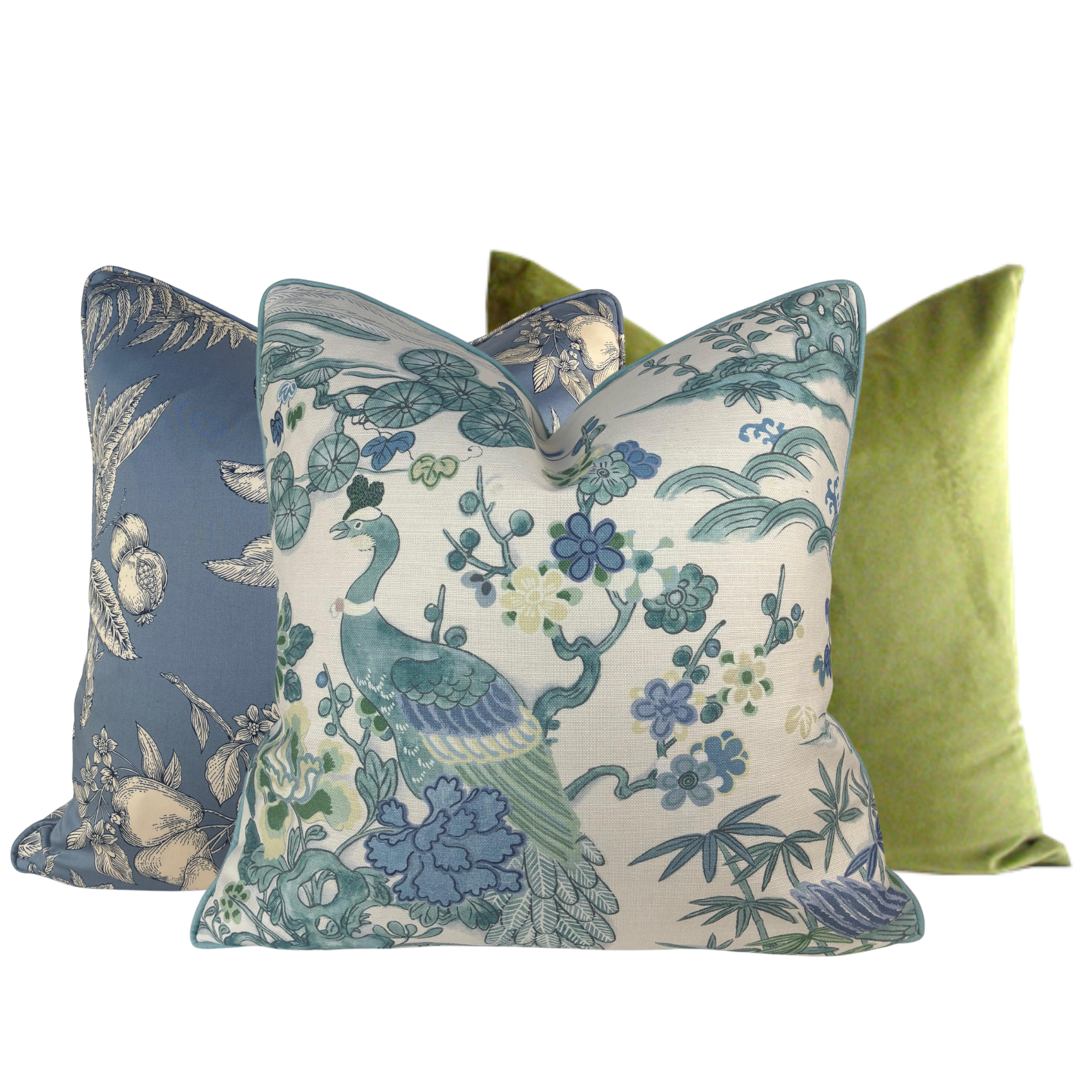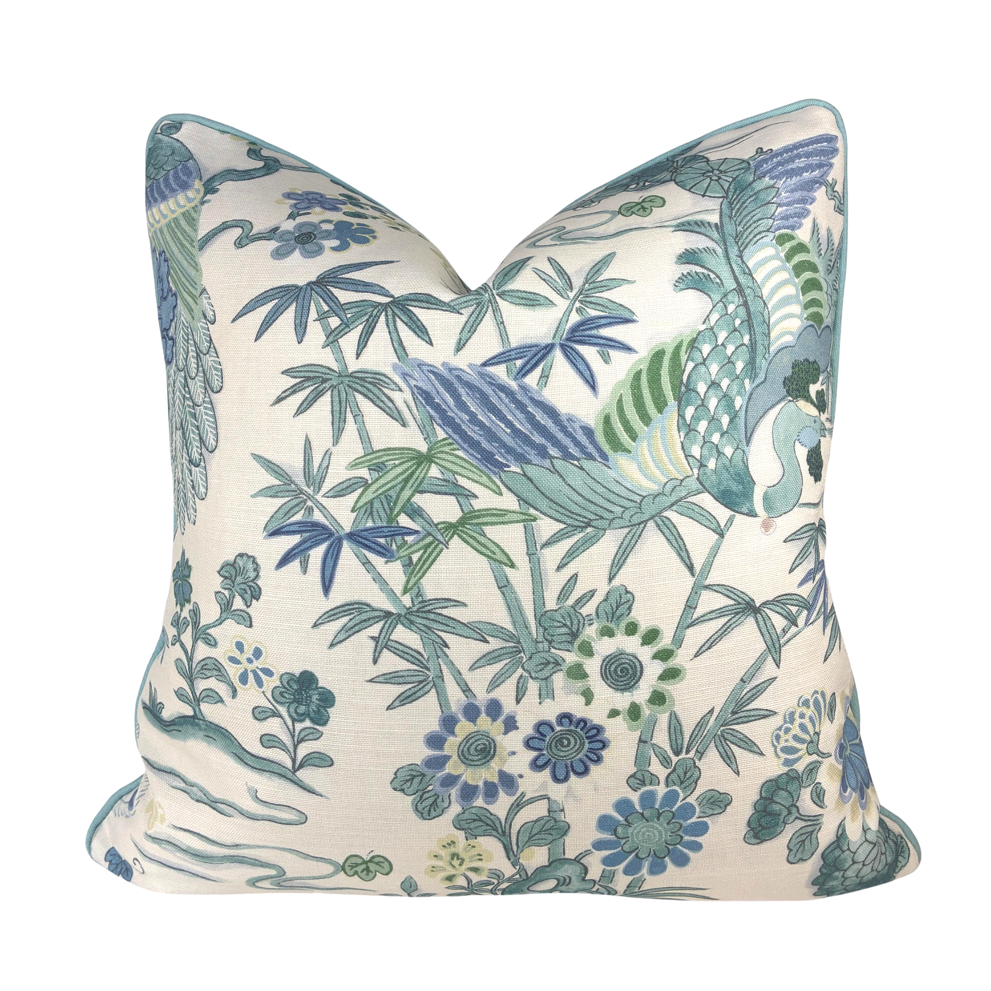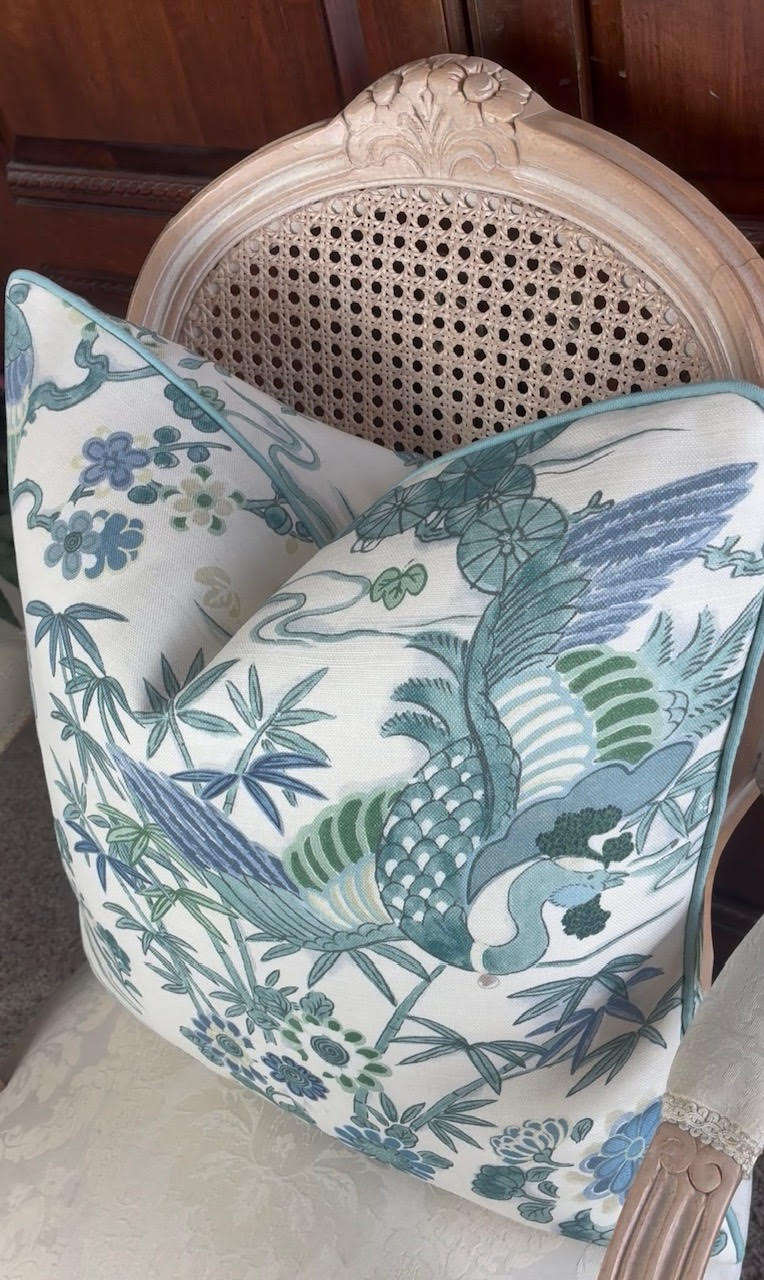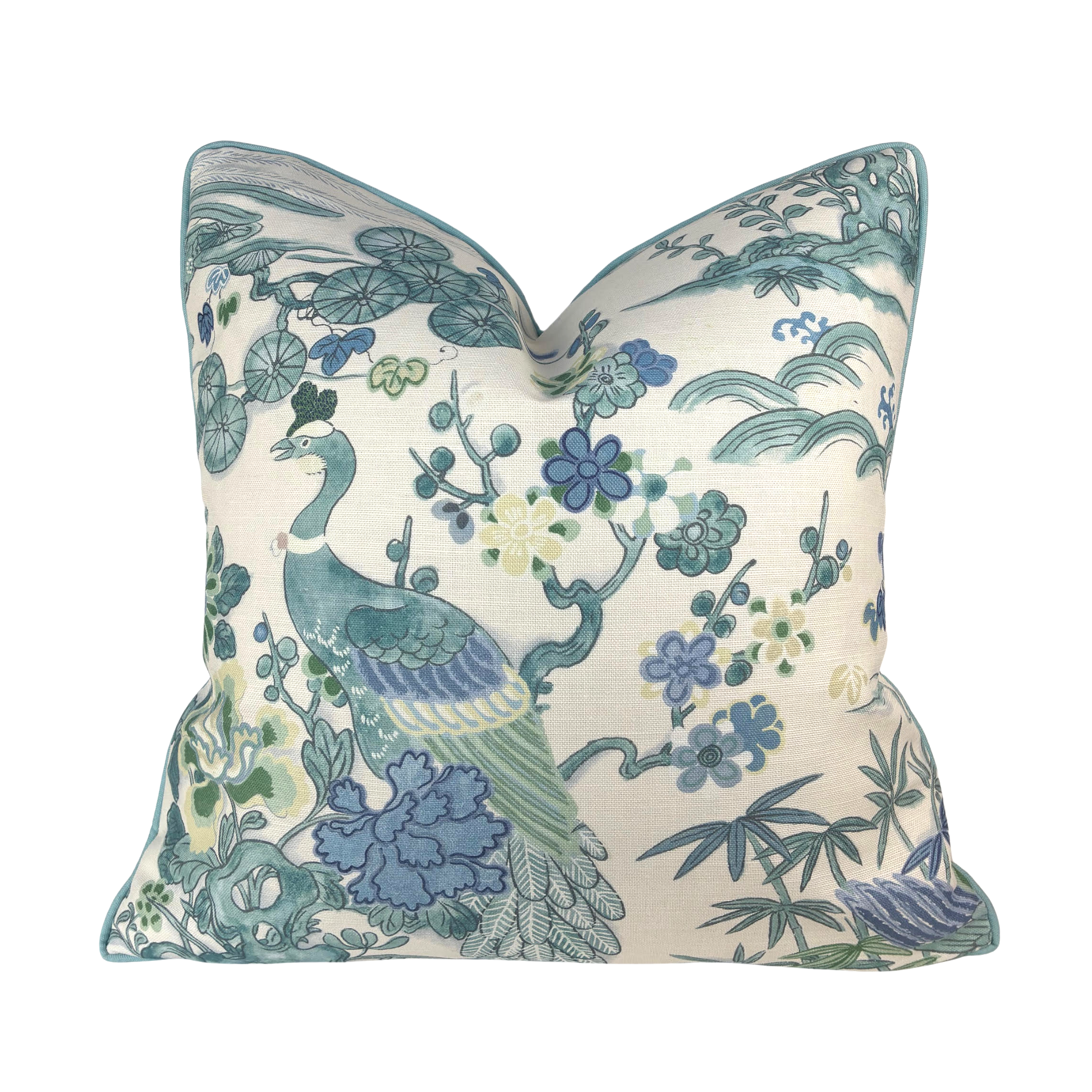 Inspired by Asian textiles from the 20th century, Sakura’s hues of blue and teal dogwood, peacocks, bamboo, and peonies, printed on medium weight ivory linen blend fabric, will add a classic.and timeless style to any space.